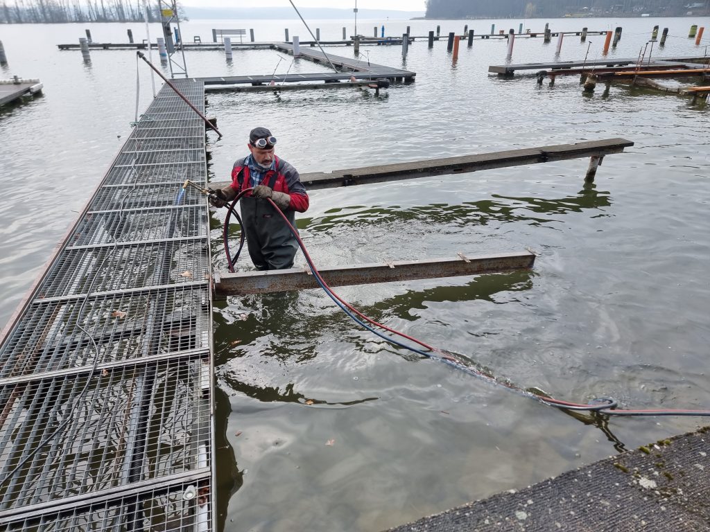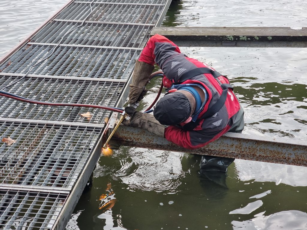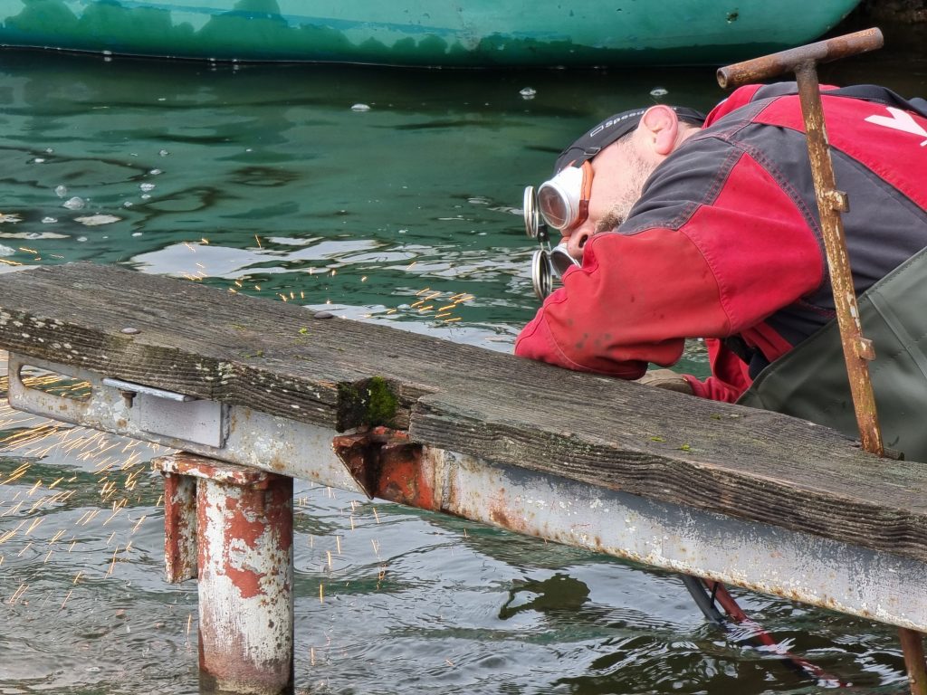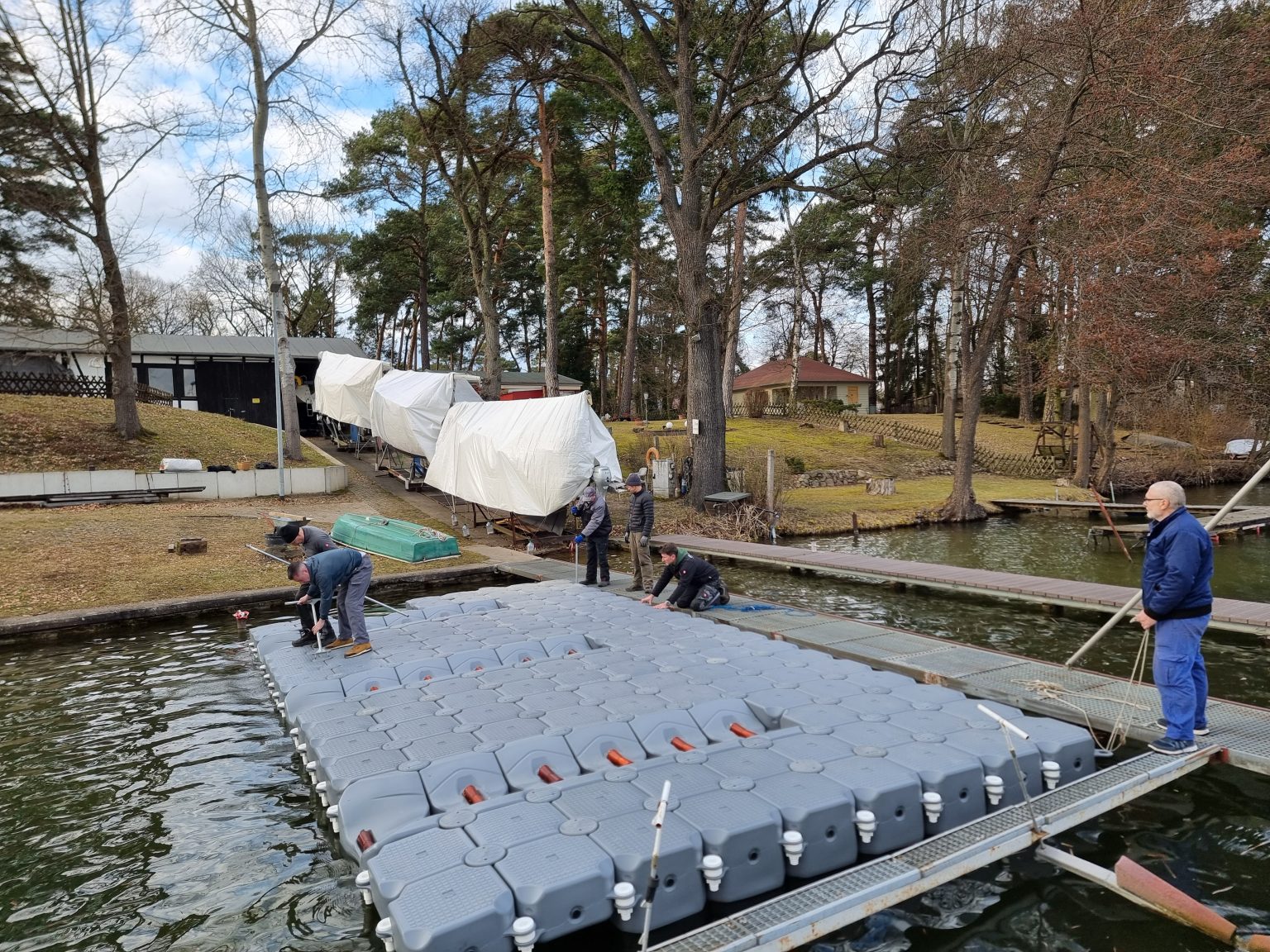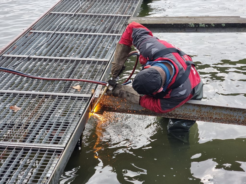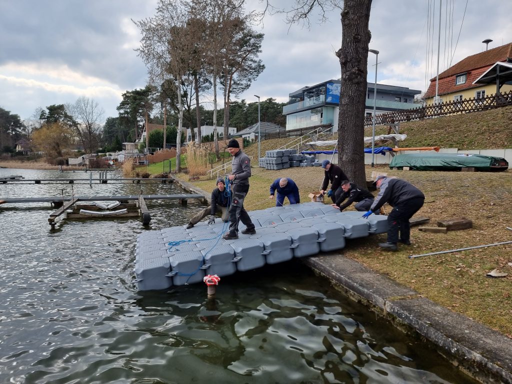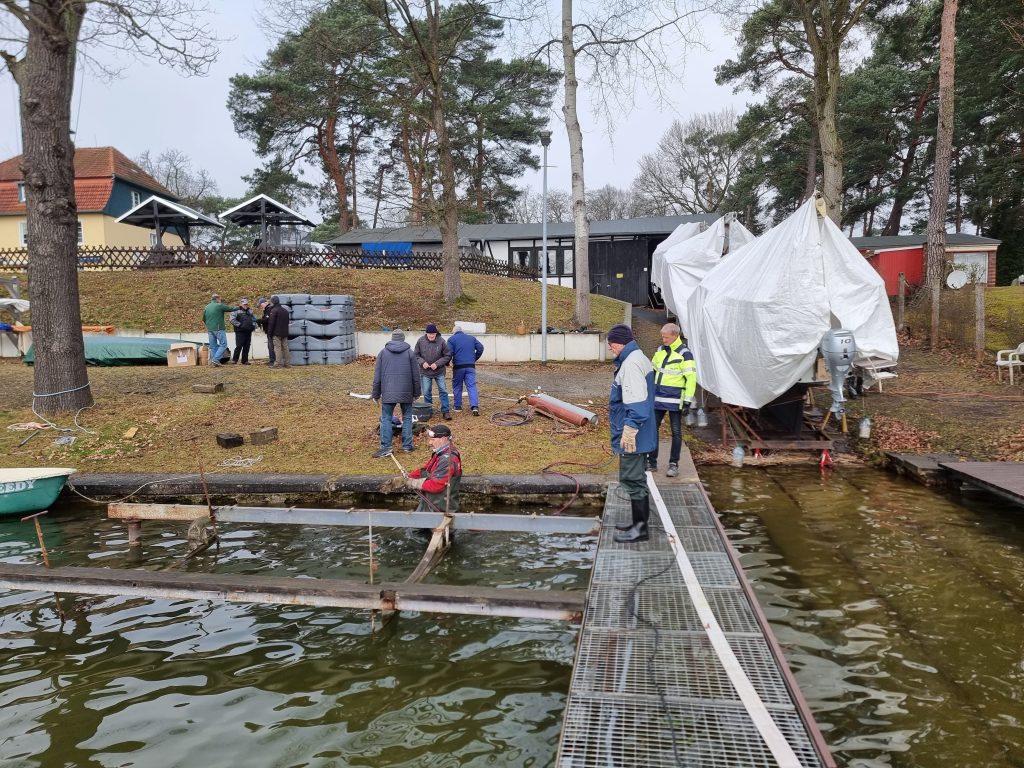 Heute fanden sich zwei Arbeitsgruppen zu einem Spezialauftrag im Verein zusammen. Während das eine Team die noch notwendigen Restarbeiten zum Rückbau der Steganlagen im Innenhafen durchführte, konnte das andere Team die Montage der Pontons vornehmen.